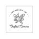Este sello de goma personalizado "Mano hecha con amor" incluye una mariposa con un nombre de negocio personalizado.