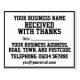 Recibido con el sello de goma de agradecimiento con nombre, dirección, etc. Incluye espacio para escribir una fecha. Añade tu nombre comercial, dirección, número de teléfono y correo electrónico.