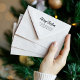 Un sencillo y elegante sello de dirección para sus tarjetas de felicitación vacacional. Las palabras "Feliz Navidad" aparecen en un elegante guión caligráfico de escritura a mano. Añade tu nombre y dirección en sans serif negro.