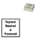 Este diseño de sello de goma incluye el mensaje "Pago recibido y procesado". Podría utilizarse para marcar que una factura o factura se ha pagado íntegramente.