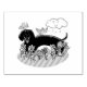 Dachshund en primavera - Dachshund lindo, sonriente, negro y bronceado jugando en la hierba con flores florecientes, pájaros voladores y una nube feliz, sonriente y lluviosa. Derechos reservados © Angi Laframboise. Ropa de personalizados de raza de perro de temporada para los amantes del perro.