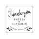 Tipografía de pelucas rústicas Gracias sello de goma Boda. Crea tu propio sello de agradecimiento rústico y elegante. El diseño tiene textos de Gracias en escritura elegante, nombres de novias y novios, fecha boda y ramas rústicas. Personalice sus datos.