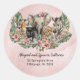 Un collage de animales pequeños de la selva del safari silvestre dulce — jirafa, cebra, pantera, tigre y elefante — se esconden en un ambiente acogedor entre los hibiscos tropicales y la vegetación de la monstera en este diseño de dirección de retorno. El fondo es una acuarela rosa degradado.Diseño compuesto por Holiday Hearts Designs.