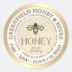 Patrón dorado de abeja sobre un fondo amarillo pálido rodeado por un borde de marfil con tu nombre colmenar, descripción de miel, dirección, nombres de apicultores e información de contacto. Abeja estilizada. HONEY está escrito en un tipo de letra metálico de estilo "grabado en relieve" de oro. ¡No te olvides de añadir tu peso neto de miel!