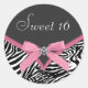 Pegatinas elegantes de dieciséis cumpleaños de cebra rosa. Esta pegatina de cebra rosa y negra es fácilmente personalizable para tu evento simplemente eligiendo el botón "¡Personalízalo!" para comenzar a agregar los detalles de tu evento, estilo de fuente, tamaño y color de la fuente, y redacción. Por favor, ten en cuenta que todas las pegatinas, tarjetas y diseños de invitaciones que encontrarás en Zazzle son gráficos impresos sin joyas, lazos, partes o piezas elevadas, en relieve o añadidas.