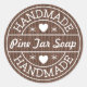 Pegatina con el texto "hecho a mano" en blanco diseñado como sello en un fondo de madera oscura. Nombre del producto de personalizable.