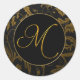 Sellos de monograma negro y dorado con un bello guión de texto sobre un elegante damasco floral. ¡Estos pegatinas le añaden un toque de clase único a sus invitaciones de boda!