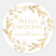 Un guión de oro muy bonito La Feliz Navidad se ve moda y elegante en un brillante fondo blanco. Está rodeado por una moderna corona dorada con una variedad de ramas, bayas y conos. Su nombre está escrito a continuación. Es muy fácil reemplazar su propio nombre por el texto de la plantilla. Use esto para sellar los sobres de tarjetas de sus Navidades o para colocarlos en paquetes de Navidades.