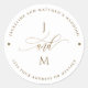 Elegante pegatina blanco y boda dorado, ideal para el sello para sobres de la etiqueta de favor. Capacidad de añadir cualquier mensaje que le guste en la parte superior y inferior de la llanta externa, ideal para los nombres de la pareja y la dirección para el sello para sobres, o para el mensaje de agradecimiento y fecha para los favores. Centro con las iniciales de la pareja con "y" en elegante caligrafía escrita a mano moderna. Nota: la tipografía no está en Relieve metalizado real, sino más bien impresa en un tono dorado. Parte de nuestra colección "Elegant Calligraphy Minimalista Boda".