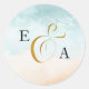 Sello para sobres boda monogramado con orilla de mar con letras a mano y acuarela. Este bonito diseño cuenta con una playa de arena y un fondo marino. El ampersand está en una elegante caligrafía de oro y la plantilla está lista para que añadas las iniciales de novia y novio. Diseño sencillo y acogedor para una boda de destino tropical, boda vintage de la costa, náutica o temática de verano. Por favor, busque en mi tienda la colección Boho Beach, para coordinar invitaciones, tarjetas de alojamiento y accesorios de correo.