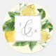 Estos modernos sellos para sobres de boda en monograma amarillo limón son perfectos para un boda de primavera o verano. El diseño rústico mediterráneo presenta limones acuáticos brillantes y hermosos con flores blancas bohemias y elegantes hojas verdes. Personaliza a estos pegatinas con las iniciales de la novia y el novio.