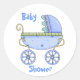 Invitación a la ducha de bebé/sello para sobres de invitación. Gráficos personalizados de un bebé buggy colorido, sobre un fondo blanco, con texto azul leyendo Baby Shower, que se pueden personalizar para leer lo que se desee. Gran toque final a la invitación a ducharse de un bebé.
