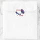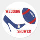 Divertidos pegatinas de sellos para sobres con temas de fútbol invitan a participar. Hecho en forma redonda, con un fondo blanco y gráficos de un fútbol rojo y azul siendo pateado con un elegante estilete azul en tacón alto. El texto rojo dice ducha de bodas. Personalice el texto para su evento.