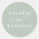 Un elegante y simple pegatina de sello para sobres con un sutil verde silencioso con texto blanco para personalizar con los nombres de la novia y del novio. Estos sellos le dan un agradable toque personal a su boda o invitaciones para eventos.