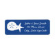 Una etiqueta azul de dirección de retorno está decorada con un dólar de arena blanca y una estrella de mar a la izquierda y muestra texto a la derecha para personalizarlo para hacerlo propio. Utilice estas etiquetas en el exterior de sus invitaciones o tarjetas de "Gracias" para un toque elegante, especialmente cuando se combina con las otras Maravillas de Verano en tarjetas azules, o cambie a las etiquetas de tamaño de dirección estándar para predirigir las tarjetas RSVP para sus huéspedes.