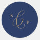 Estos delicados sellos para sobres de boda en monograma dorado y marina son perfectos para un boda moderno. El romántico diseño minimalista presenta una encantadora y elegante tipografía de champán amarillo dorado sobre un fondo azul marino con un aspecto limpio y sencillo. Personaliza a estos pegatinas con las iniciales de la novia y el novio.