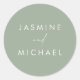 ¡Selle los sobres de su boda con estos sellos para sobres sencillos y elegantes! El diseño presenta sus nombres con letras blancas modernas, complementadas con un guión manuscrito con un fondo verde sabio. Estos pegatinas verdes de bodas de sabio moda son perfectos para sellar sobres, agregar favores de boda, y más!