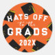 Sellos para sobres creativos de graduación, etiquetas partidarias o pegatinas de regalo de grado con gorras de graduación en negro y oro sobre antecedentes naranjas.