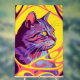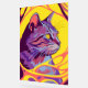 This illustration features a stylized cat's head in profile, rendered with bold lines and a striking color palette of purples, oranges, and blues. The cat has bright yellow eyes and prominent whiskers. The background is a vibrant yellow, surrounded by swirling, organic shapes in purple, pink, and orange, which create a dynamic, almost fluid frame around the cat. The overall artwork creates a sense of energetic movement and a surreal, pop art aesthetic.