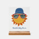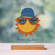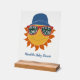 Celebremos a las futuras mamás con un divertido bebé aquí viene la ducha temática del Sol. Este letrero tiene un ilustracion divertido de un sol personalizado usando gafas de sol y un gorra de cubo de amarillo, naranja, rojo y azul. El signo está listo para ser personalizado con el texto de su personalizado debajo del gráfico.