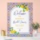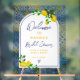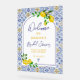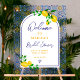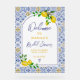Nuestra inspiración italo-mediterránea en patrón de azulejos cerámicos azules combinada con limones amarillos y verdes alegres pintados a mano en aquarela crea un letrero de bienvenida para despedida de soltera fresco y moderno en acrílico transparente que seguro impresionará. Con una forma de arco moderna y letra a pincel elegante. Impresiona a tus invitados con este diseño trendy y único que hará que todos hablen.