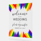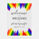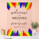 Letrero de bienvenida de boda de acrílico LGBTQ arcoíris con bandera de orgullo de pinceladas impresa en el fondo de acrílico transparente y enmarcando el texto negro. Bienvenidos a sus invitados de boda con este letrero de boda LGBTQ impreso en acrílico con una versión artística de la bandera de orgullo en forma de pinceladas en los colores de la bandera arcoíris.