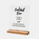 Mejora tu ocasión especial con este letrero de acrílico rectangular transparente, adornado caprichosamente con 'Bar abierto - Toma una copa - y - Deslízate hacia los aperitivos de la fiesta' en letra cursiva negra sobre fondo transparente. Ofrece la flexibilidad de personalizar o adaptar el mensaje. Perfecto para bodas, fiestas, compromisos, baby showers, aniversarios y más. Puedes incluir una base de bloque de madera natural resistente para una exhibición independiente fácil, que se combina perfectamente con las mesas de boda y las decoraciones del evento.