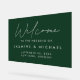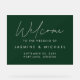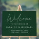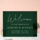 Bienvenido a sus huéspedes bodas con este sencillo y elegante cartel de acrílico de bienvenida a la boda. El signo de bienvenida horizontal boda presenta un guión blanco escrito a mano con fondo acrílico verde cazador. Personalice el signo de bienvenida verde oscuro con sus nombres, fecha de boda y ciudad/estado. El cartel de bienvenida acrílico boda es ideal para su boda contemporáneo.