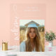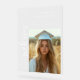 Bienvenido a su fiesta de posgrado con un elegante cartel acrílico claro con texto en blanco y foto. "Bienvenida" aparece al lado en la caligrafía de escritura moderna. Personalice la plantilla con su foto, título del evento, año de clase y escuela. © Kimbellished, LLC