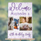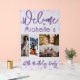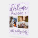 Tablero de bienvenida a la fiesta de cumpleaños para su cumpleaños. Señal acrílica con collage de 4 fotos y mensaje de bienvenida. El tamaño que se muestra es de 20 x 30 pulgadas. Lila con texto morado para personalizar con su nombre. Incluya cuatro fotos divertidas de la cumpleañera, con amigos, familiares o mascotas. Cada foto debe ser vertical u horizontal para que quepa fácilmente en el espacio. Coloque la señal en un caballete en la entrada del lugar de la fiesta para dar la bienvenida a los invitados.