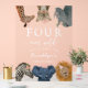 Fun safari tema 4.º fiesta de cumpleaños con ilustracion de animales salvajes. El cartel dice "cuatro salvajes en la historia". Los animales están usando artículos de fiesta rosado.