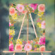 Un letrero de bienvenida para la ducha de la novia con ilustración floral pintada a mano en flores silvestres rosadas, amarillas y melocotón, rosas, eucalipto verde salvia y follaje sobre acrílico transparente. Perfecto para fiestas y bodas de verano al aire libre.