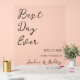 Cartel de bienvenida de boda personalizado (acrílico transparente con letras negras) con la cita "mejor día de la historia" en caligrafía de escritura, los nombres de la pareja y la fecha. Todo el texto es editable y puede ser personalizado con un salmo, poema o cualquier mensaje que quiera añadir para esta ocasión especial.