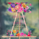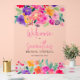 Un letrero de bienvenida audaz de tono rosa brillante con flores de jardín en acuarela para fiesta de desposada con flores rosas pintadas a mano, rojas, púrpuras, naranjas y follaje verde con hojas de eucalipto y una fuente de pincel moderno en acrílico transparente claro.