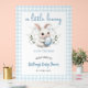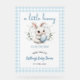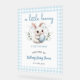 Este diseño presenta la temática de la ducha de bebé de Pascua "A Little Bunny Is On The Way" para los niños de la ducha de bebé con manta de gingham azul pastel y un lindo conejo de conejo blanco con un ilustracion azul de huevo de Pascua. Este producto se puede personalizar fácilmente con sus datos personales.