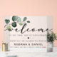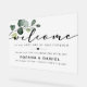 Moderno simple y elegante con caligrafía "bienvenida" y letrero de boda de acrílico con follaje de eucalipto verde.