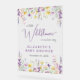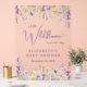 Un elegante cartel de bienvenida acrílico con una elegante ducha de bebé, con "una pequeña flor silvestre en camino" escrito en una mezcla de tipografía gris claro y un elegante guión morado, y acuarelas llamativas inspiradas en boho de flores silvestres moradas, rosas y amarillas. Añada el nombre de la futura madre con letras simples de color púrpura.