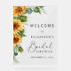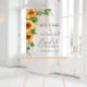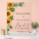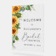 Letrero de bienvenida de desayuno nupcial rústico de acrílico transparente con un ramo de flores de girasol y vegetación de eucalipto, un guión de caligrafía chic y tipografía serif elegante.