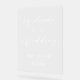 Cartel de bienvenida minimalista de boda blanco con un elegante guión de caligrafía, impreso en acrílico transparente. Personalizar los colores para que coincidan con el tema.