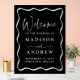 Bienvenido a su boda con estilo, con este moderno boda de color negro y blanco ondulado en el marco acrílico. El diseño presenta sus nombres y detalles bodas con letras blancas que contrastan con un fondo negro. Los detalles bodas están rodeados de un borde blanco ondulado que da a este boda un toque de modernidad y retro.
