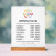 Este elegante cartel acrílico muestra las horas de apertura de su negocio en un estilo moderno y minimalista. Perfecto para la marca corporativa, es una forma sencilla de mantener informados a los clientes. Personalizable con su texto, este signo es ideal para pequeñas empresas que buscan realzar su presencia promocional. Aumente la experiencia de su cliente con esta solución elegante y de marca.