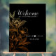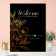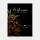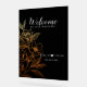 El diseño presenta elegantes flores doradas, follaje y un sencillo guión de bienvenida.