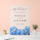 El boda de las flores de hidrangea azul grande es un signo de "bienvenida" hecho de acrílico. Este diseño incluye una estrella de mar, con un tema boda costero. Tiene un fondo opaco y el diseño se ajusta a todos los tamaños de signos. El texto es negro - para el texto de bienvenida y los nombres impresos de la novia y el novio. Se utiliza un color gris oscuro para otro texto y la fecha boda. Flores realistas de hidrangea azul claro a lo largo del fondo tienen una estrella blanca de la estrella de la estrella del mar escondida en las flores. Se utilizan secuencias de comandos y fuentes impresas modernas. Los grandes signos, como este, se doblarán, así que planeen adherirlos de alguna manera al stand para una buena medida. Lea más sobre el producto en la descripción.