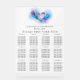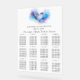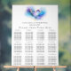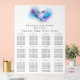 Elegant wedding seating chart featuring a blue, purple and gold abstract watercolor heart design.