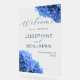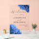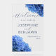 Flores de horangea azul boda bienvenido el signo acrílico. Gran tamaño de 20 x 30 pulgadas - con otras opciones de tamaño - este signo es completamente transparente con texto azul oscuro. Imágenes florales realistas decoran las esquinas inferior y superior. Los nombres están en mayúsculas, impresos con el día del boda debajo. Se levantan, en un caballete, o se exhiben de alguna otra manera, fuera de una iglesia o lugar para recibir a los huéspedes.