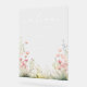 Este diseño presenta un ilustracion de delicadas flores silvestres y mariposas en tonos rosas y verdes.