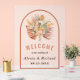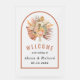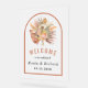 Diseñe un hermoso letrero de bienvenida de boda de acrílico translúcido helado que presenta un toque tropical al agregar hojas de palma secas, hierba de pampas y flores de protea en tonos encantadores de terracota rosa y beige. El marco del arco, de color terracota, realza perfectamente los tonos vivos de los acentos botánicos. Esta mezcla distintiva de texturas y colores sin duda servirá como un punto focal impresionante para cualquier celebración de boda.