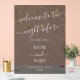 Una hermosa manera de dar la bienvenida a sus huéspedes a su cena de boda. Un minimalista y elegante texto blanco sobre purpurina dorado transparente negro esmerilado se ve el cartel de boda de caligrafía de bienvenida acrílico con texto personalizado. ¡Personalízala para adecuarla a tu gusto!