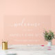 boda de moda recibe un cartel acrílico transparente que presenta "Bienvenidos a nuestro feliz eterno después" en una mezcla de simple tipografía blanca y un elegante guión blanco, "estamos tan contentos de que estés aquí", tus nombres unidos por un corazón y tu fecha boda.