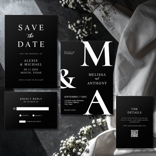 Moderno Rótulo Minimalista negro y blanco Boda. Presenta una tipografía audaz en monograma y un diseño gráfico mínimo.